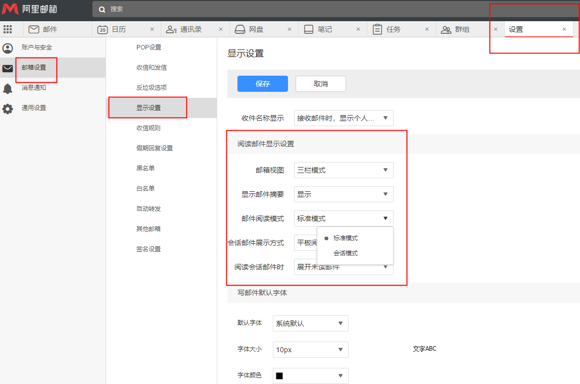 1、登录邮箱后点击右上角“邮箱设置”,在左侧展开设置功能列表中点击“邮件阅读显示”。可选择标准模式或会话模式,会话邮件展示方式可选择气泡或平板阅读。同时还可对邮件页头信息显示详细、正文引用是否显示、会话邮件展开方式进行设置。
