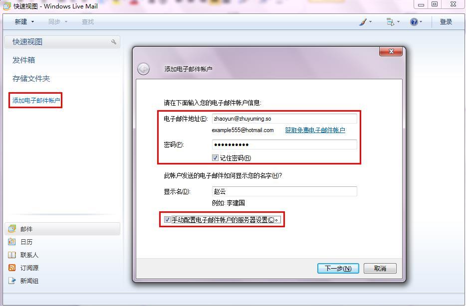 1.打开 Windows Live Mail 后单击左侧 添加电子邮件账户 ,填写您的邮件地址和密码,单击 下一步 ,如图: